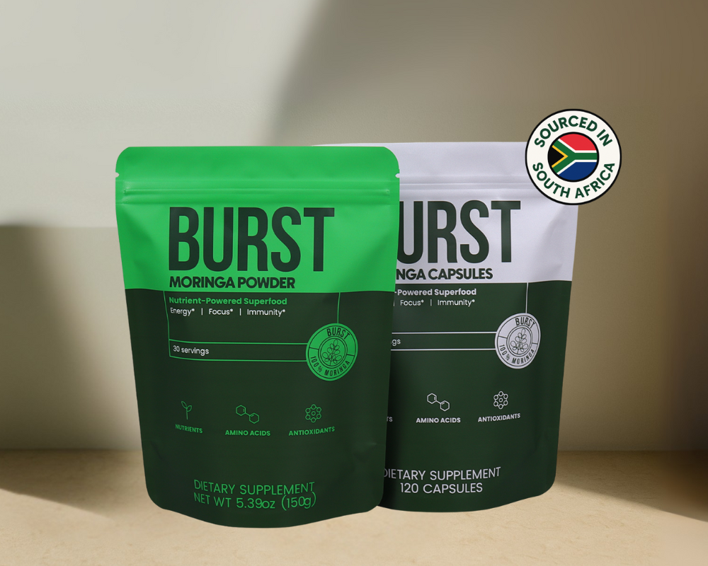 BURST begins at the source: moringa grown under intense African sun and rooted in some of the most nutrient-dense soil in the world. We harvest only young leaves - the most potent part of the plant - and process them with care to lock in naturally occurring vitamins, minerals, and antioxidants.
